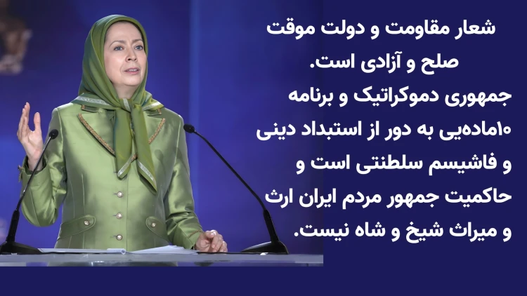 مسعود رجوی-۱۷ اسفند ۱۴۰۴شورشگـران بـرپـاسرانجام «کینگ مجتبی خامنهای» بر تخت سلطنت مطلقه ولایت فقیه نشستجنگ ما با ولایت و سلطنت برای آزادی و استقلال تا پیروزی انقلاب دموکراتیک مردم ایران بیوقفه و بیامان ادامه مییابدبرقرار باد جمهوری دموکراتیک و دولت موقتبر اساس برنامه ۱۰ مادهیی شورای ملی مقاومت ایران و رئیسجمهور برگزیده برای دوران انتقال حاکمیت به مردم ایراناز آن ما و خلق ماست پیروزی- از آن ما و خلق ماست فـردا