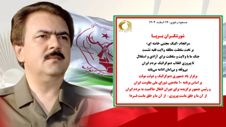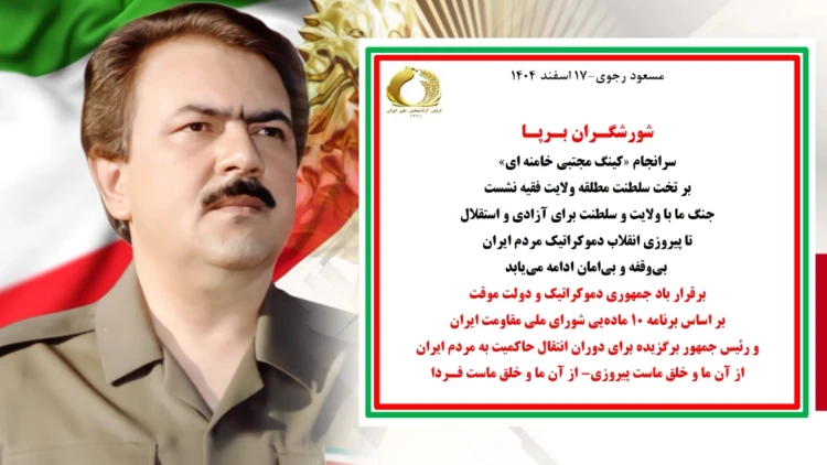مسعود رجوی- ۱۱ اسفند ۱۴۰۴جنـگ جنـگها و آزمایـش آزمایشـاتبرای پایان ۱۰۰ سال استبداد و خجسته میـلاد آزادی و جمهوری دموکراتیکخامنـهای مـرد، خلـق زنـده میشـودبه شرط اینکه نگذاریم محصول رنج و خون و مقاومت ۴۷ ساله در برابر شیخ خونریز و رژیم ولایت فقیه رادنبالچهٔ شاه ستمگر و فاشیسم سلطنتی سرکوبگر به سرقت ببردخمینی در آستانهٔ ۹۰ سالگی حکم قتلعام مجاهدین را نوشتآخرین آزمایش خامنهای هم در ۸۷ سالگیآن «کیسههای سیاه» کشتار قیام دیماه بود.