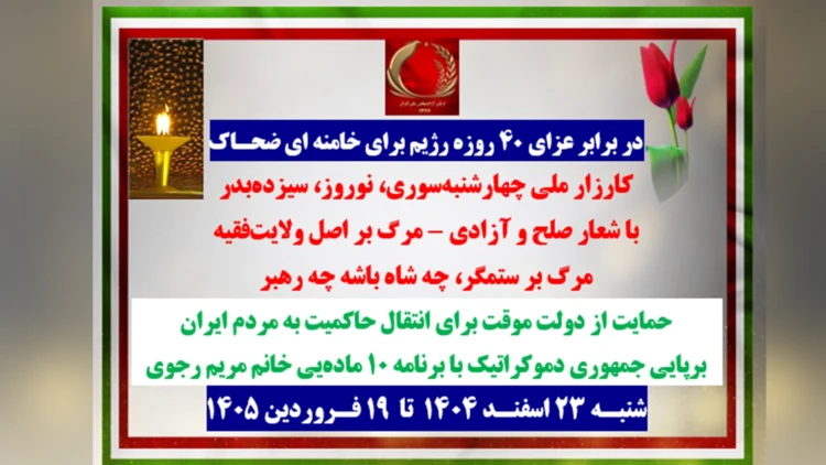 در برابر عزای ۴۰ روزه رژیم برای خامنه ای ضحاک کارزار ملی چهارشنبه سوری، نوروز، سیزده بدر با شعار صلح و آزادی - مرگ بر اصل ولایت فقیه مرگ بر ستمگر، چه شاه باشه چه رهبر حمایت از دولت موقت برای انتقال حاکمیت به مردم ایران