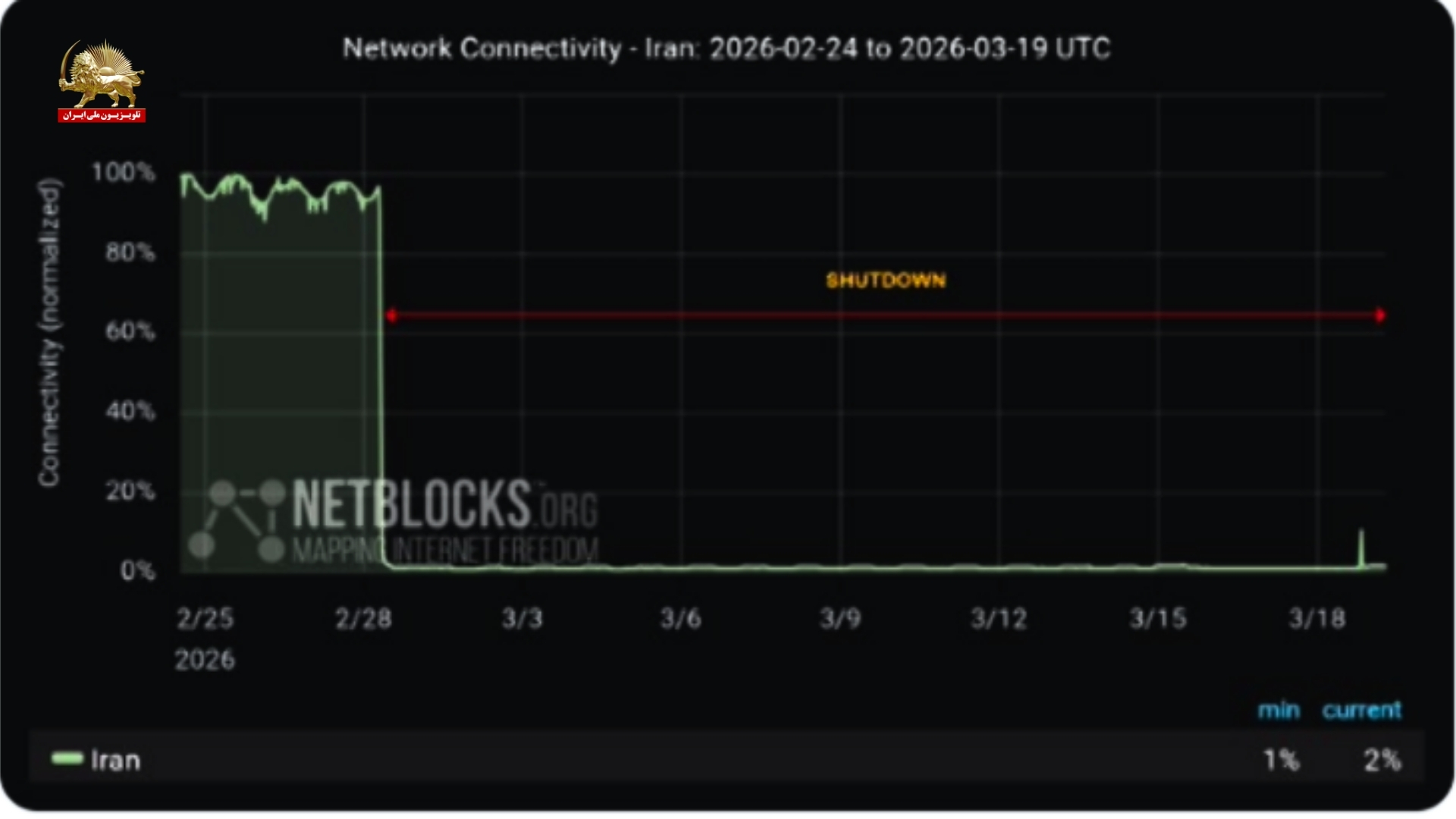 نتبلاکس پنجشنبه ۲۸ اسفند اعلام کرد - قطعی اینترنت ایران وارد بیستمین روز خود شده است و اتصال بینالمللی برای عموم مردم بیش از ۴۵۶ ساعت در دسترس نبوده است. نتبلاکس افزود: این حادثه اکنون طولانیترین قطعی ثبتشده در تاریخ ایران است و از قطعی اعمالشده در جریان اعتراضات ژانویه پیشی گرفته است.