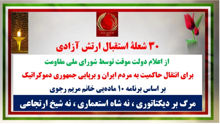 ۳۰ شعلهٔ استقبال ارتش آزادی از اعلام دولت موقت توسط شورای ملی مقاومت برای انتقال حاکمیت به مردم ایران و برپایی جمهوری دموکراتیک بر اساس برنامه ۱۰ ماده یی خانم مریم رجوی مرگ بر دیکتاتوری، نه شاه استعماری، نه شیخ ارتجاعی * انفجار در ۲ حوزه جهل و جنایت در…