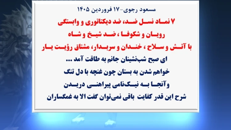 مسعود رجوی-۲۵ اسفند ۱۴۰۴بچه شاه میگوید جنگ را کمک آورده و بیصبرانه در انتظار ورود به نخستین شهرآزاد شدهٔ ایران استقبلاً گفته بودیم حرف شورشگران و ارتش آزادیستان هم ساده و روشن و فقط دو کلمه است: بیـا! بیـا!اکنون باید اضافه کرد که تصرف حتی یک وجب از خاک ایران توسط هر طرف و عناصر دستنشانده مانند بچهٔ شاه، مضافاً بر تعارض آشکار با قوانین بینالمللی غیرقابل قبول و به سود فاشیسم دینی حاکم بر ایران است«کینگ» مجتبی خامنهای ولیفقیه نورسیده، نخستین طرفی است که از آن سود میبرد تا مبارزه جبهه متحد خلق در ایران با استبداد دینی را به انحراف بکشاندبا سوءاستفاده از ناسیونالیسم ایرانی مانند جنگ ۸ ساله با عراق خود را درگیر یک جنگ ملی و وطنپرستانه جلوه دهد و در نتیجه رژیم ولایت فقیه جان بدر ببردصد سال است که جنگ اصلی در ایران بین آزادی با استبداد و شاه و شیخ ستمگر استبچهٔ شاه میخواهد به مخاطبان خود بگوید بچهٔ خامنهای جای مرا گرفته من مانند پدربزرگم یا مانند پدرم با کودتا یا مثل چلپی با بمبها «در نخستین شهر آزاد شده» بهزودی فرود میآیم! قبلاً هم گفتم که از سال ۲۰۰۰ با سپاه در ارتباط بودهامسرلشگر زاهدی کودتاچی و پسرش اردشیر زاهدی و همچنین شعبان بیمخ تاجبخش، مردهاند اما ثابتی سرشکنجهگر ساواک را بر دوش گذاشته برایتان سوغاتی میآورم تا دمار از روزگار پنجاه و هفتیها که میلیون میلیون «مرگ بر شاه» میگفتند در بیاوریمپاسـخ مـردم و آزادیخواهان ایـران پیوسته این است: مـرگ بـر ستمگــر، چـه شـاه باشـه چـه رهبــر