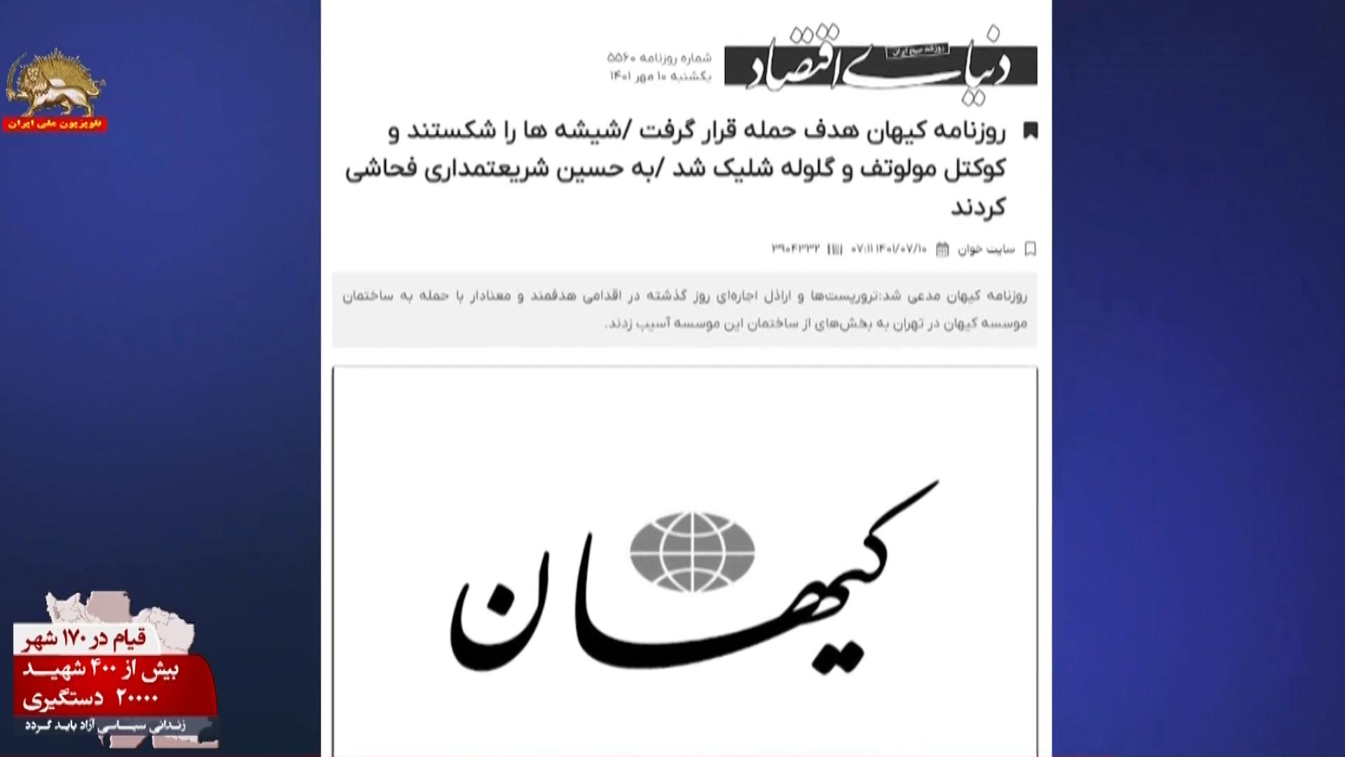 به اعتراف رسانههای حکومتی جوانان در تهران با کوکتل مولوتف به ساختمان کیهان خامنهای حمله کردند. دنیای اقتصاد رژیم نوشت: عصر شنبه تعدادی به دفتر روزنامه کیهان حمله کرده و ضمن شکستن شیشههای روابط عمومی و پنجرههای بیرونی به بخشهایی از ساختمان این مؤسسه نیز آسیب زدند.