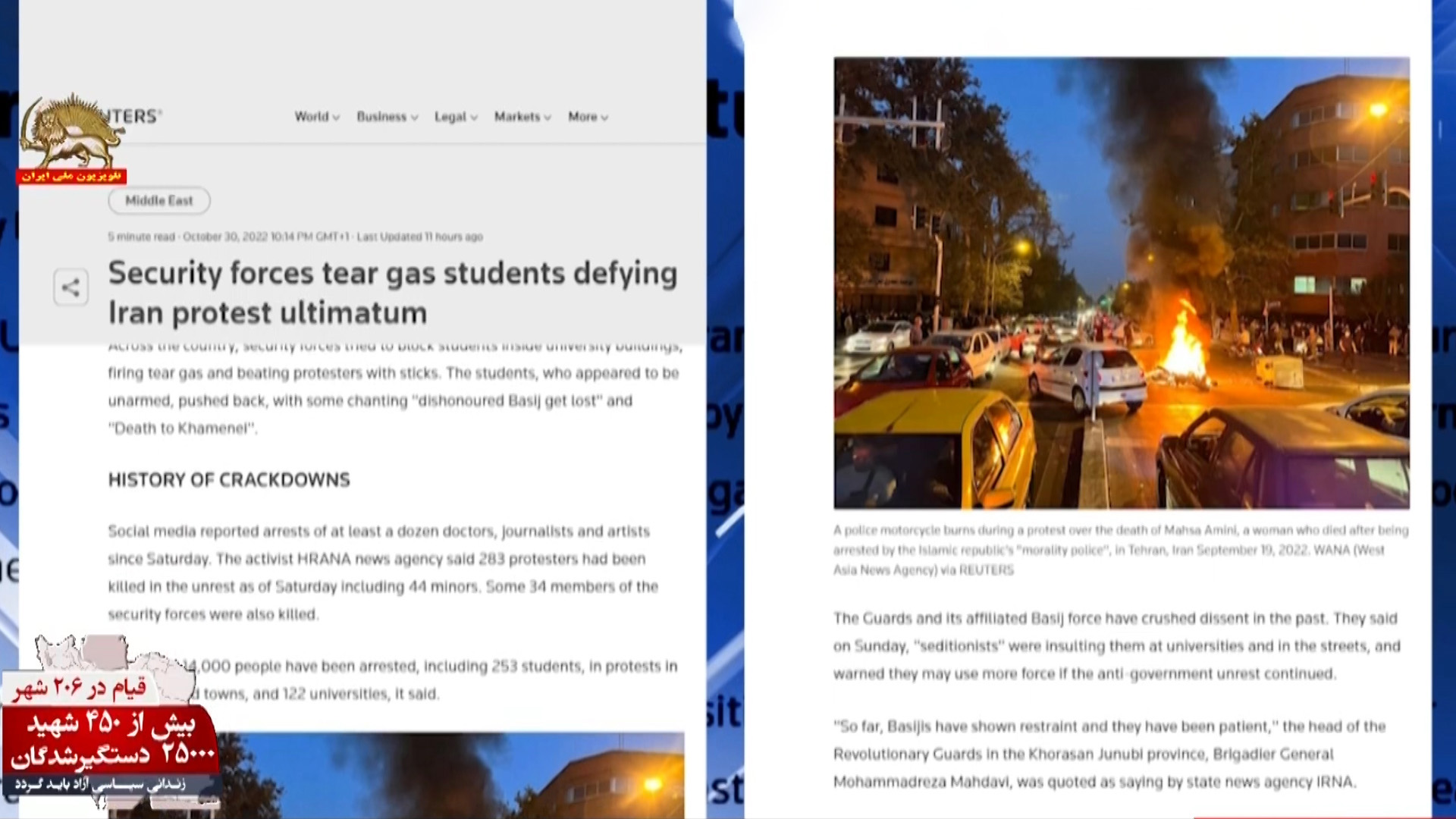 خبرگزاری رویترز گزارش داد: اعتراضات در ایران روز یکشنبه وارد مرحله خشونت آمیزتری شد. ویدئوهای شبکههای اجتماعی نشان میدهند، که معترضان با گاز اشک آور و تیراندازی نیروهای امنیتی مواجه شدند.