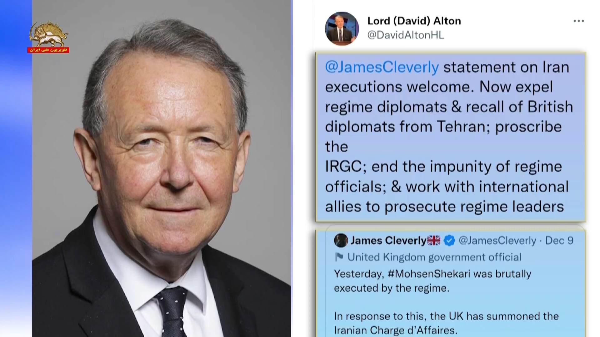 لرد آلتون عضو مجلس اعیان انگلستان در حساب توییتری خود نوشت: در پی اعدام محسن شکاری باید دیپلوماتهای رژیم ایران را اخراج کنیم. دیپلوماتهای انگلستان را از تهران فرابخوانیم. به مصونیت سران رژیم ایران پایان بدهیم و در همکاری با همپیمانان بین‌المللی سران رژیم را به محاکمه بکشیم.