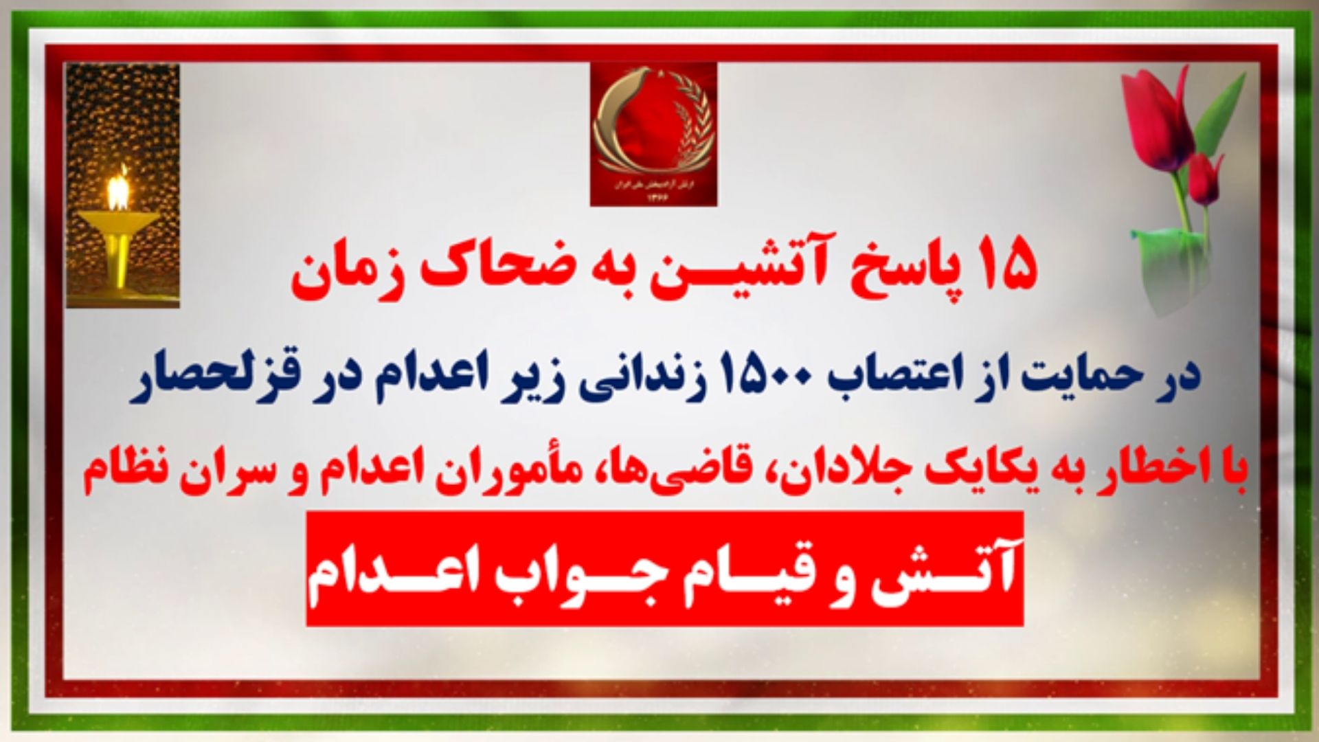 ۱۵پاسخ آتشیـن کانون‌های شورشی به ضحاک زمان در حمایت از اعتصاب ۱۵۰۰زندانی زیر اعدام در قزلحصار با اخطار به یکایک جلادان، قاضی‌ها، مأموران اعدام و سران نظام