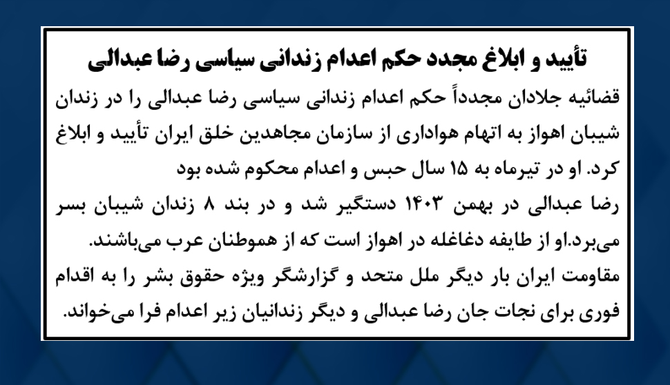 قضاییه جلادان مجدداً حکم اعدام زندانی سیاسی رضا عبدالی را در زندان شیبان اهواز به اتهام هواداری از سازمان مجاهدین خلق ایران تأیید و ابلاغ کرد.