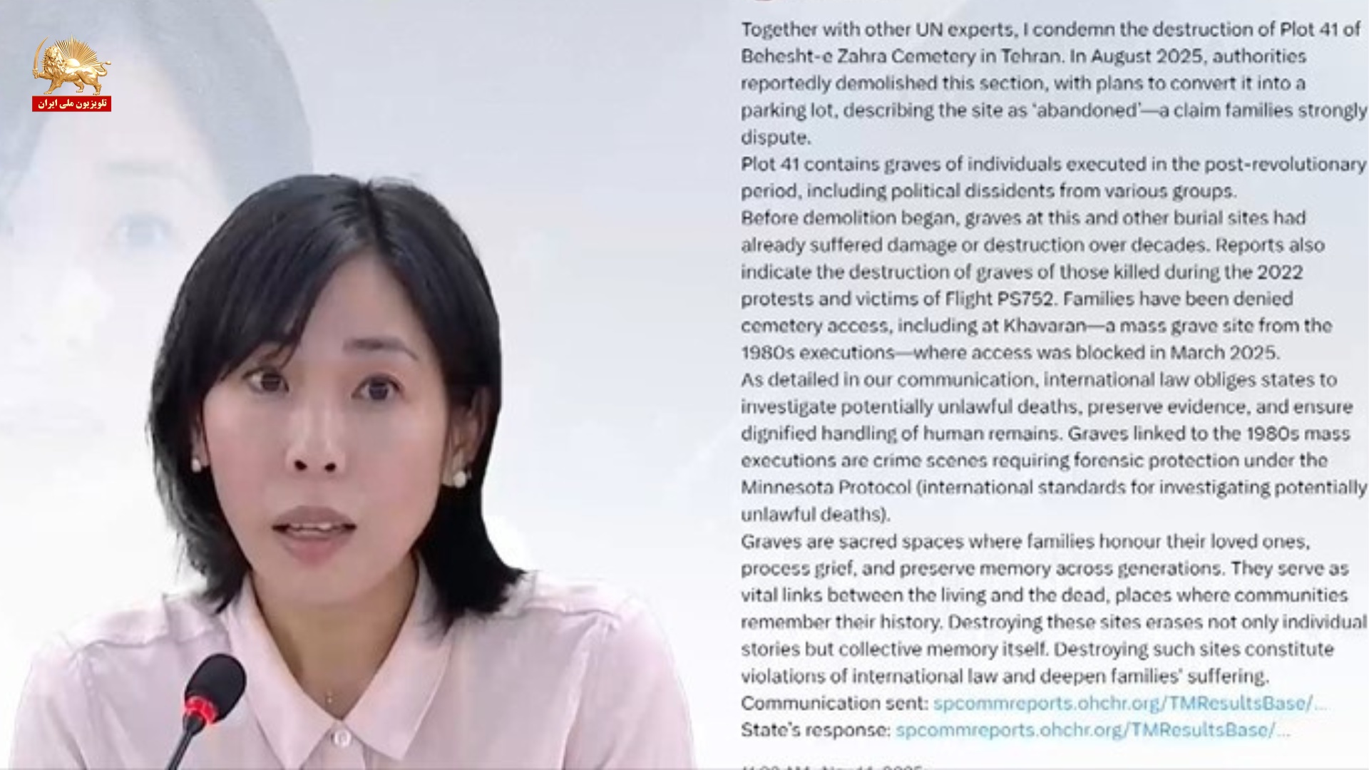 تخریب قطعه ۴۱بهشت زهرا توسط رژیم ایران نوشت: «من و دیگر کارشناسان سازمان ملل متحد، تخریب قطعه ۴۱آرامستان بهشت زهرا در تهران را محکوم کردهایم. مقامات[رژیم] در اوت ۲۰۲۵این بخش را تخریب کردند و قصد دارند آن را به پارکینگ تبدیل کنند؛ اقدامی که آن را با «متروکه» خواندن این محل توجیه کردهاند، در حالیکه تخریب چنین مکانهایی نقض حقوق بینالملل است و رنج خانوادهها را عمیقتر میکند».