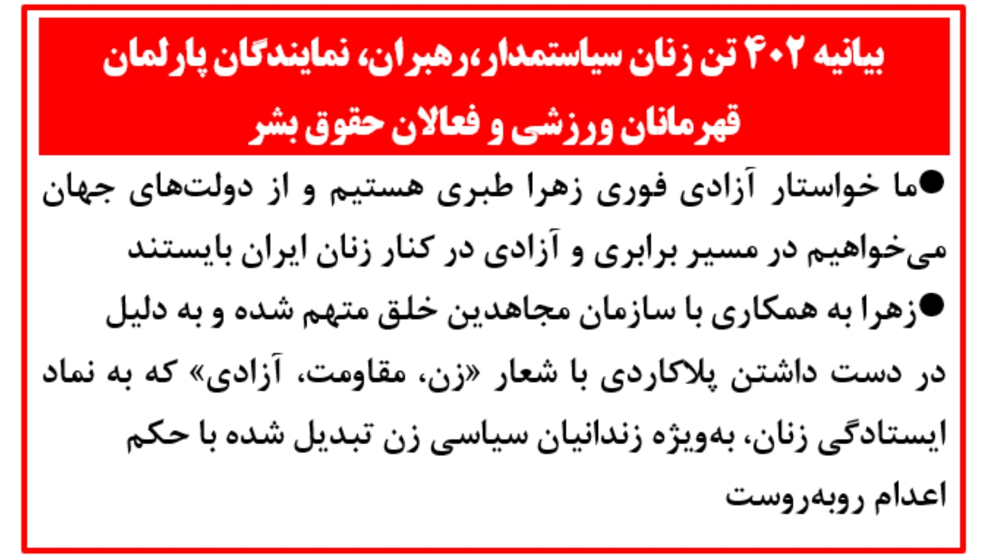 بیانیه ۴۰۲ تن زنان سیاستمدار، رهبران، نمایندگان پارلمان، قهرمانان ورزشی و فعالان حقوق بشر