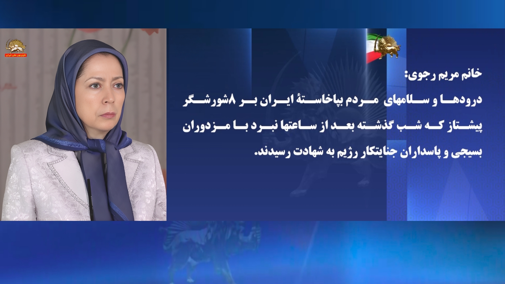 درودها و سلام‌های مردم به‌پاخاسته ایران بر ۸شورشگر پیشتاز که شب گذشته بعد از ساعت‌ها نبرد با مزدوران بسیجی و پاسداران جنایتکار رژیم به شهادت رسیدند. آن‌ها برای جلوگیری از نیرو‌رسانی دشمن برای سرکوب مردم به مقابله با جنایتکاران موسوم به یگان ویژه پرداختند. این خون‌ها فقط اراده مردم را برای تغییر راسخ‌تر می‌کند.