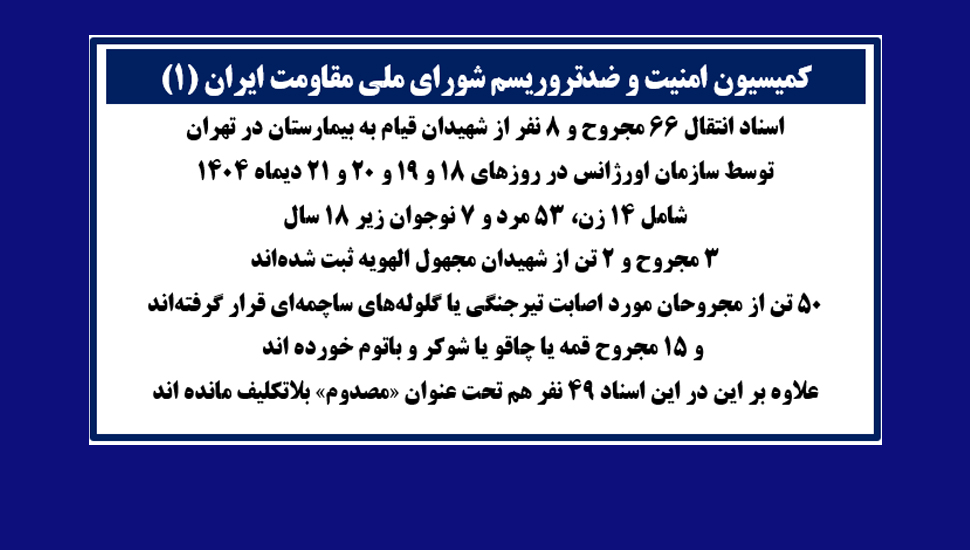کمیسیون امنیت و ضدتروریسم شورای ملی مقاومت، اسناد روشنگر انتقال ۶۵ مجروح و ۹ تن از شهیدان قیام به اورژانس تهران در روزهای ۱۸ و ۱۹ و ۲۰ و ۲۱ دیماه ۱۴۰۴ را به اطلاع هموطنان میرساند. واضح است که این اسناد بخش بسیار کوچکی از واقعیت و جدای از پیکرهایی است که به مکانهای دیگر مانند کهریزک و پزشکی قانونی منتقل شده است. همچنین بسیاری از مجروحان مستقیماً به بازداشتگاهها و زندانهای رژیم در سپاه و انتظامی و وزارت اطلاعات و به خانههای امن برده شدهاند.