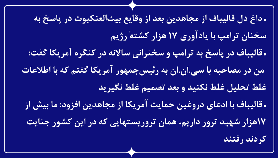 • داغ دل قالیباف از مجاهدین بعد از وقایع بیت‌العنکبوت در پاسخ به سخنان ترامپ با یادآوری ۱۷ هزار کشتهٔ رژیم