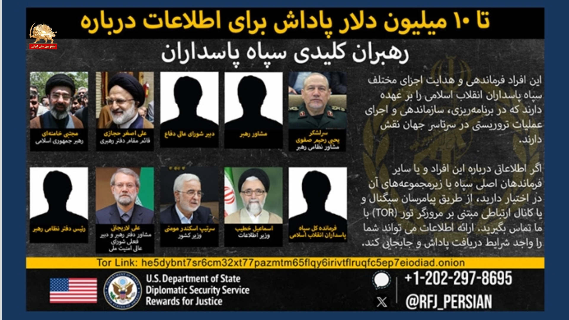 وزارت امور خارجه آمریکا روز جمعه اعلام کرد که در چارچوب برنامه «پاداش برای عدالت»، مبلغ ۱۰ میلیون دلار جایزه برای ارائه اطلاعات درباره مجتبی خامنه‌ای، رهبر جدید رژیم آخوندی، و چند مقام ارشد دیگر این رژیم در نظر گرفته است. در فهرست این برنامه اسامی علی لاریجانی، اسکندر مومنی، اسماعیل خطیب و یحیی رحیم صفوی نیز قرار دارد.