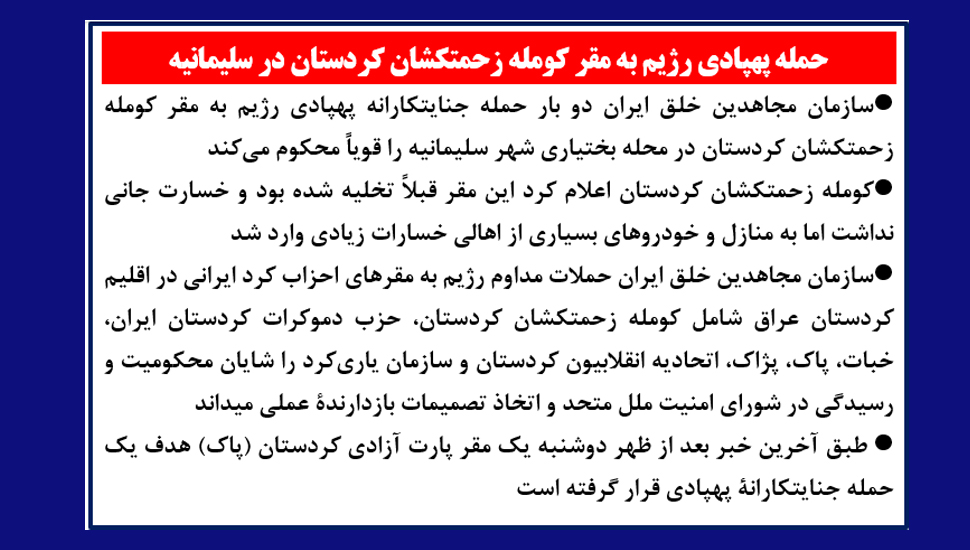 سازمان مجاهدین خلق ایران دو بار حمله جنایتکارانه پهپادی رژیم به مقر کومله زحمتکشان کردستان در محله بختیاری شهر سلیمانیه را قویاً محکوم میکند
