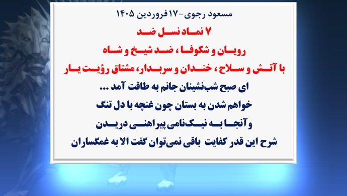 مسعود رجوی – ۱۷ فروردین ۱۴۰۵ ۷ نماد از نسل ضد رویان و شکوفا، ضد شیخ و شاه با آتش و سلاح، خندان و سربدار، مشتاق رؤیت یار ای صبح شبنشینان جانم به طاقت آمد... خواهم شدن به بستان چون غنچه با دل تنگ و آنجا به نیکنامی پیراهنی دریدن شرح این قدر کفایت باقی نمیتوان گفت الا به غمگساران