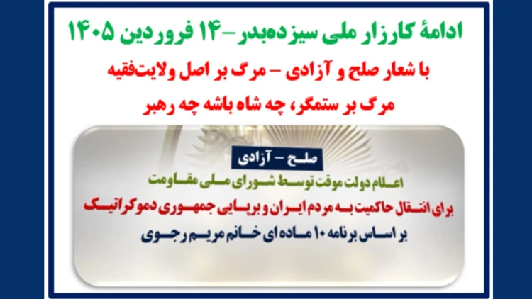 کارزار ملی سیزده بدر [webroot/media/2026/04/%DA%A9%D8%A7%D8%B1%D8%B2%D8%A7%D8%B1%20%D9%85%D9%84%DB%8C%20%D8%B3%DB%8C%D8%B2%D8%AF%D9%87%20%D8%A8%D8%AF%D8%B1.jpg] کارزار ملی سیـزده بدر با شعار صلح و آزادی - مرگ بر اصل ولایت فقیه