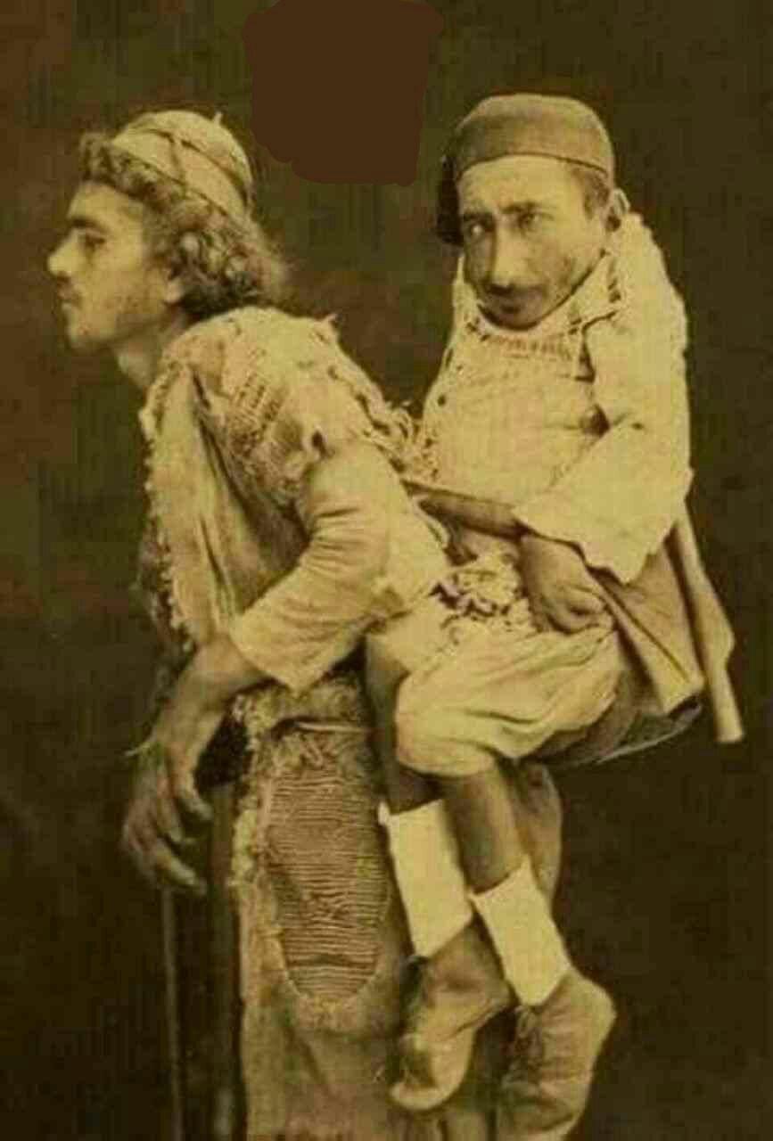 تصویری واقعی که در سال ۱۸۸۹ میلادی در دمشق گرفته شد! کوتوله معلول مسیحی به نام سمیر، بر دوش دوست نابینای مسلمان خود به نام عبدالله بود! سمیر بر دوش عبدالله در رفت و آمدهایش به او وابسته بود و نقش چشم عبدالله نابینا را داشت و در کوچه پس کوچه های دمشق با راهنمایی وی، عبدالله از چاله ها و پستی بلندی ها می گذشت! یکی می دید و دیگری راه می رفت، اینچنین همدیگر را کامل می کردند! هر دو در کودکی یتیم شدند و بدون سرپرست در اتاقی با هم زندگی و کار می کردند! سمیر قصه گو بود و در یکی از قهوه خانه های قدیمی و معروف دمشق برای مردم قصه می گفت و عبدالله روشندل کنار قهوه خانه نخود و لوبیای داغ می فروخت! سمیر قبل از عبدالله درگذشت و عبدالله به شدت متاثر شد، طوری که یک هفته تمام در اتاقش گریست، تا جائی که جسد بی جانش که از شدت اندوه فوت شده بود را در اتاقش پیدا کردند! این دو مرد ساده دل، که دین یکدیگر را نفهمیدند، با هم زندگی کردند و به انسانها ثابت کردند که ما به همدیگر نیاز داریم بدون اینکه دین و باور یکدیگر را در نظر بگیریم!