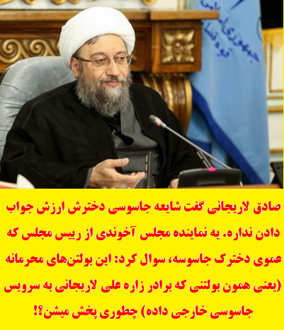 صادق لاریجانی گفت شایعه جاسوسی دخترش ارزش جواب دادن نداره. یه نماینده مجلس آخوندی از رییس مجلس که عموی دخترک جاسوسه، سوال کرد: این بولتنهای محرمانه (یعنی همون بولتنی که برادر زاره علی لاریجانی به سرویس جاسوسی خارجی داده) چطوری پخش میشن؟!